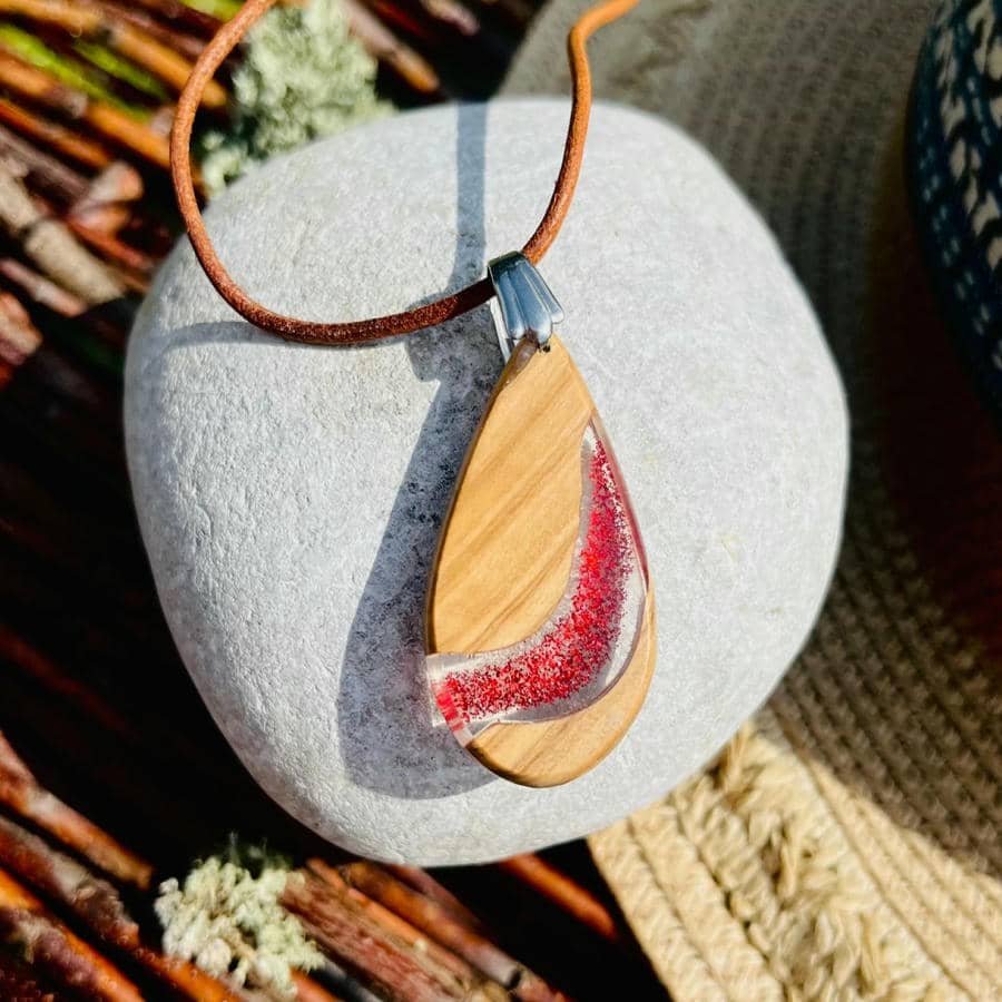 Hole dir einen einen Hauch von Natur mit unserem wunderschönen Anhänger aus Eschenholz in Tropfenform. Die außergewöhnliche Maserung in Kombination mit dem intensiven roten Glitter, der in klarem Harz eingebettet ist, wird zum Hingucker an jedem Outfit. Ein einzigartiges Stück mit natürlicher Schönheit.