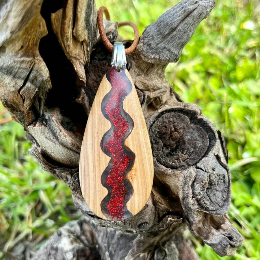 Dieser einzigartige Anhänger Tropfenform besteht aus hochwertigem Eschenholz und ist mit einer wunderschönen Maserung versehen. Der funkelnde rote Glitter, der in das Harz eingearbeitet ist, verleiht dem Anhänger eine besondere Note. Ein elegantes Accessoire, das jeden Look vollendet.